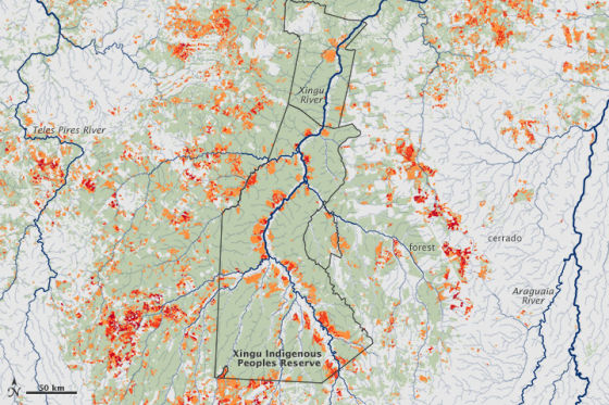 土著民族森林保护区内的大火集中在兴谷河沿岸,因为河流是亚马逊流域土著人的主要交通枢纽。在森林前沿的农场和牧场中,火灾也很常见,但分布更分散。