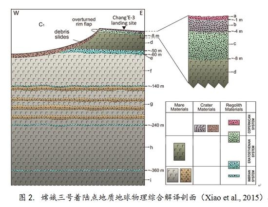 该撞击坑形成之后,月面受到了持续的陨石撞击和空间风化作用,并在溅射毯之上形成了厚度大约1米的月壤。测月雷达对次表层深达近400米的地下结构进行了探测,其中低频和高频雷达分别获得了深部和浅部的地质结构信息,共识别出7个主要地质界面。综合区域地质分析,本文对这些界面的性质进行了分析,首次揭示了雨海纪(39-32亿年)和埃拉托欣纪(32-15亿年)多次玄武岩及火山碎屑岩对雨海的充填事件,以及多个火山事件间隔期形成的月壤层等(图2)。这一成果显示,雨海经历的火山事件和撞击改造及空间风化事件异常复杂,需要重新思考月球的火山地质与热演化历史。