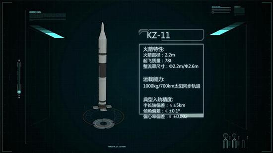 KZ-11运载火箭采用车载移动方式发射,能够满足卫星商业化、高密度、快速发射的需求。火箭起飞质量78吨,近地轨道最大运载能力1500公斤,太阳同步轨道运载能力1000公斤/700千米,主要承担400千米-1500千米近地和太阳同步轨道小卫星、微小卫星单星及多星组网发射任务。