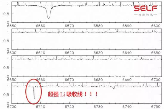 在分析过程当中,我发现有一条光谱有点问题。大家注意看左下角6700埃的地方,这本来不应该有任何谱线。我们进行了反复地排查,最后证明这不是数据的错误,而是一条真实存在的、非常强的Li吸收线。