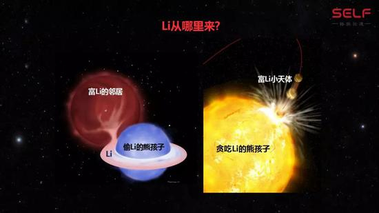 比如说这颗贫金属星的边上住了一个邻居,它很喜欢收藏Li,贫金属星靠近它的时候,顺便顺走了一点;或者是有一颗带了很多Li的小天体,恰巧经过这颗贫金属星,被它一口吃进了肚子里。