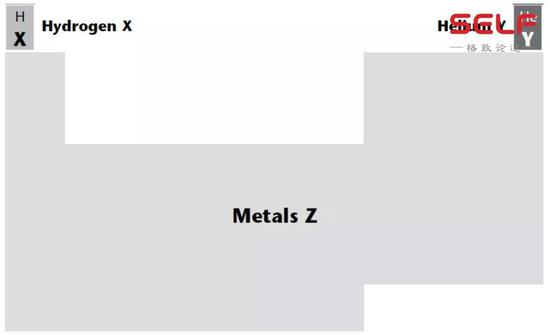 这是一张大家都很熟悉的元素周期表,有没有人一看到它就觉得头大呢?天文学家非常人性化,他们发明了一张特别的元素周期表,我们把所有比氦重的元素全部称为金属,注意是所有比氦重的元素,不仅仅是我们日常概念中的金属,这些金属元素的总和,就叫作金属含量。