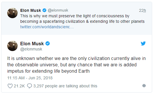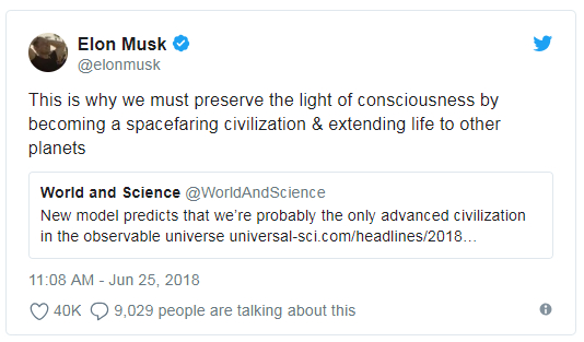 马斯克在分享文章后指出,人类有可能是唯一的先进文明,正是因为这个原因,人类必须离开地球,前往其它星球。他说:“正因如此,我们必须成为太空文明,将生命传播到其它星球,这样才能保留意识之光。”
