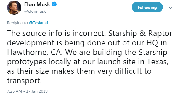 马斯克在Twitter中说:“星际飞船和Raptor引擎的开发仍正在加州霍桑总部开发。我们在德克萨斯的发射地制造的是星际飞船原型机,因为星际飞船的体积使其难以运输。”