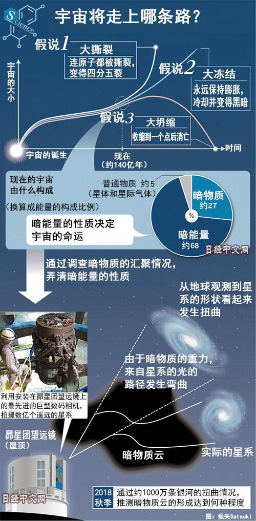 此次发表的结果根据先期完成的约1000万个星系的目录,估算了暗物质的汇聚情况。如果参考美国和欧洲的其他观测数据进行讨论,在现阶段,宇宙永远持续膨胀(大冻结)或者连原子都分裂后走向终结(大撕裂)的可能性很高,而转为收缩并消亡(大坍缩)的概率极低。