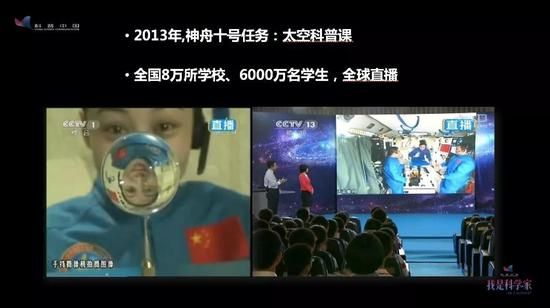 大家知道,在2013年“神十”任务中,我们进行了首次太空授课。当时全国有8万所学校、6000万学生参与了这次活动,而且是全球直播。这也是目前为止世界上在电视直播情况下规模最大、受众最广、授课时间最长和内容最丰富的一次物理教学活动。