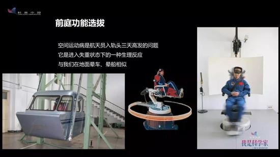 举个例子,比如“前庭功能”的选拔。航天员入轨之后,进入太空之后的头三天,是空间运动病高发的时候。“空间运动病”其实不是病,它是人在失重环境下的一种特殊的生理反应,和我们在地面上的“晕车”或“晕船”的反应类似。人进入太空之后,因为这种反应,可能会觉得会头晕目眩,严重时会呕吐。