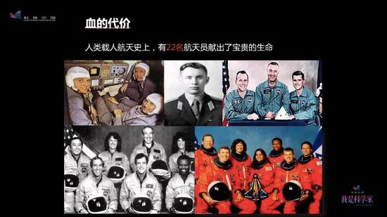 航天飞行是一个高风险的旅程。在人类航天史上,已经有22名航天员献出了宝贵的生命。刚才我说过,上升和返回的时候都有可能发生事故,比如,“挑战者号”是在上升时爆炸的,“哥伦比亚号”在返回时爆炸。