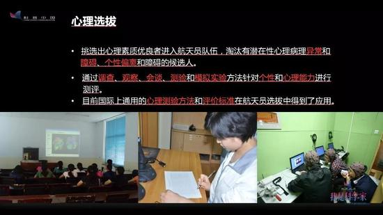 心理选拔也很重要,因为航天员在航程中要承受巨大的心理负荷,所以,我们必须淘汰掉一些有潜在的心理病理异常、个性偏离以及有障碍的候选人,选出心理素质优秀的人进入航天队伍。
