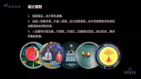 第三条坚持的原则就是:一定要有中国的元素。比如,航天员在做了水膜之后,上面放置了一个小贴片,设计师最早给这个小贴片设计的图案是一个笑脸,后来我说,我们得用中国结;包括水膜做成水球的颜色,也选了中国红,虽然其他颜色在试验中也很漂亮;另外,还有“陀螺演示”项目,除了陀螺本身是在航天技术中广泛应用的元素,制导或导航都要用到陀螺,而且陀螺的定轴性的演示只有在太空能真实地演示,地面也做不到(这个录像现在已经成了专业教学的一个教学片),还有一个很重要的原因就是陀螺是我们很多人(尤其是男孩子们)小时候都会玩的一个玩具,这也是有中国特色的;此外,还包括太空老师的选用李白的诗、曹冲称象的故事,也都是出于体现我们中国元素的考虑。