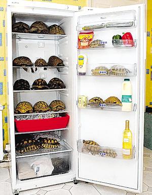 原来,雪莉经营着一家“乌龟避难所”。乌龟一般要从12月到来年3月冬眠3个月时间,它们冬眠时需要3摄氏度到8摄氏度的温度。如果乌龟过早醒来,将无法使身体保持足够的温暖,也没有足够的能量吃喝东西。而冰箱中4摄氏度到6摄氏度的温度,正好是它们冬眠的最好环境。据雪莉称,75只乌龟在被放入冰箱冬眠前,都必须连续3周不吃不喝,好让肠胃排空,因为乌龟冬眠前必须排空自己的消化系统。接着,雪莉为它们一个个洗了澡,称了重,然后裹上毛巾放入冰箱中。一些小乌龟睡在饼干桶里,而最大的乌龟则肩并肩地睡在冰箱食品格中。