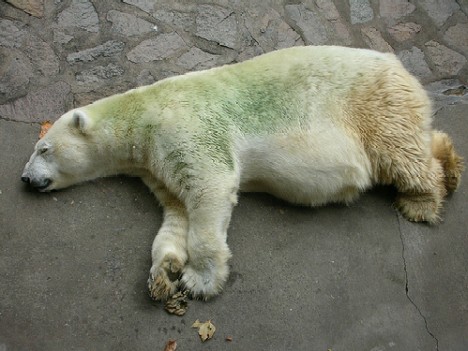 在它们自然栖息地的北极熊呈现白色、轻棕色或者白黄色(年老的北极熊)。只有生活在湿热环境的动物园中才可能变成绿色。温热而潮湿的国家如日本的动物园就很难控制北极熊馆的海藻生长。这对北极熊倒没什么,只是游人们可能会对绿色北极熊感到好奇。这里的海藻问题不同于绿色树懒的海藻:树懒欢迎海藻生长,而北极熊是无可奈何。