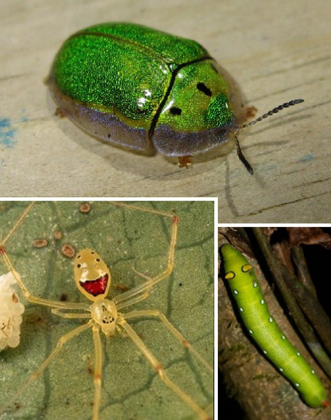 昆虫是最原始的绿色拟态动物,它们通过进化,颜色慢慢变得跟周围的植物越来越像,它们通过这种方法避开天敌,同时也不易被它们的猎物发现,更易于捕食,这对生存有利。甲虫、毛虫、蜘蛛、苍蝇,它们的外骨骼和皮肤里包含更多绿色天然色素,这是它们在数亿年间的进化过程中,逐渐获得的令人难以置信的生存法宝。