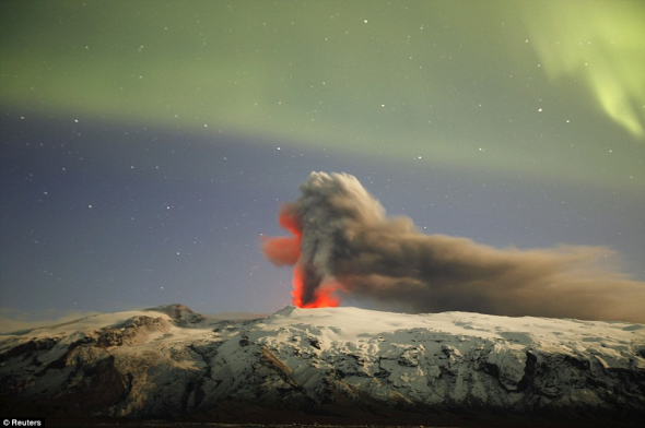 新浪科技讯 北京时间4月27日消息,据国外媒体报道,冰岛埃亚菲亚德拉冰盖火山连日来不断喷发,几天前在火山上空,北极光与火山喷射物交织在一起,空中呈现出奇幻的景象。