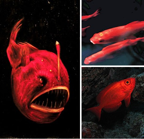 琵琶鱼,这种面目狰狞的深海鱼是红色的海底生物之一。浅海鱼也有亮红色的鱼,非常显眼,即使在阳光透过青绿色海水中依旧醒目。最近科学家发现,很多鱼发出红色荧光,似乎是对同类的识别感到宽慰。