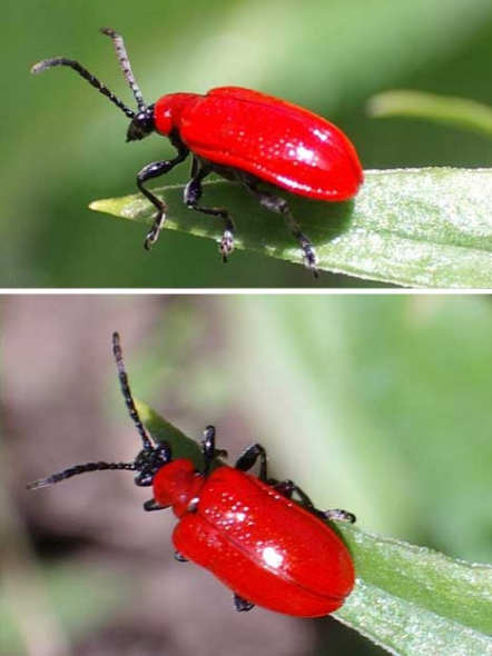 瓢虫和百合甲虫是最常见的红色昆虫,虽然瓢虫通常不同程度地带有斑点,但百合甲虫没有。与传闻所说正好相反,研磨成胭脂红的不是红甲虫,胭脂红来自一种生活在仙人掌果种的浅灰色介壳虫,这种灿烂的红色燃料是由阿兹特克人发现的。猩红色的百合甲虫长5毫米左右,但是,因为鲜亮的红色外壳它们的确非常夺目。尽管它们非常美丽,但是,百合甲虫是园丁们的克星,他们害怕看到这些红虫出现在自己的百合上。