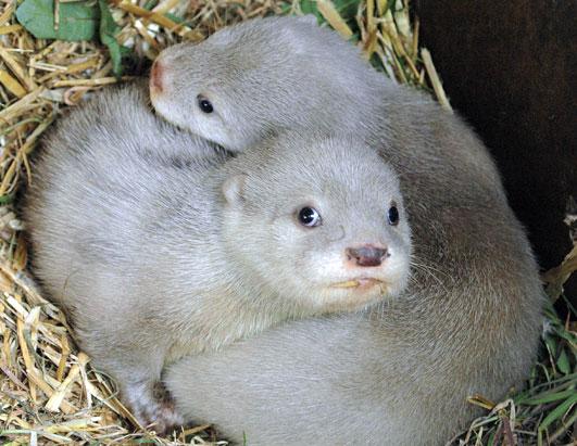 刚出生时令饲养员惊讶不已。据英国《每日电讯报》报道,它们来自于今年3月出生的一窝亚洲短爪水獭,共三只。水獭宝宝的皮毛通常呈深棕色,专家认为这对白色水獭宝宝是因患上一种名为白化基因(Leucism)的病症所致,令皮毛在没有天然色素的情况下生长,结果就变成了这个样子。