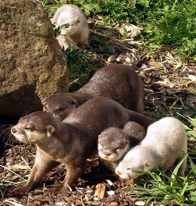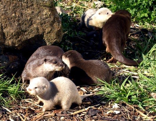 英国柴郡奥克斯市的“蓝色星球水族馆”,两只深棕色的成年水獭领着一对白色水獭宝宝和一只与其相同颜色的宝宝玩耍。