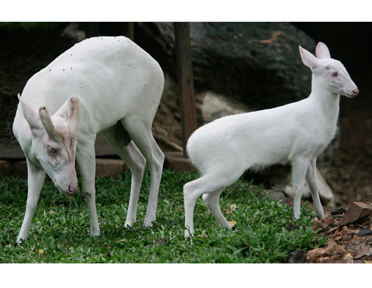 2007年5月29日,泰国曼谷律实动物园,一头名叫“帕斯”的普通赤麂在成年雄鹿旁边蹦跳嬉闹。“帕斯”只有一个月大,也遭受白化病困扰。拍摄这张照片时,“帕斯”是首次与游人见面。身患白化病的鹿被认为在泰国非常罕见。