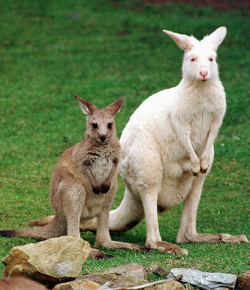 1998年1月27日,美国旧金山动物园,一只两岁大灰袋鼠与同伴注视着镜头。这只灰袋鼠名为“穆拉利”,患有白化病。最初的6到7个月,“穆拉利”是在母亲的育儿袋中度过的,它的父亲并没有患白化病。