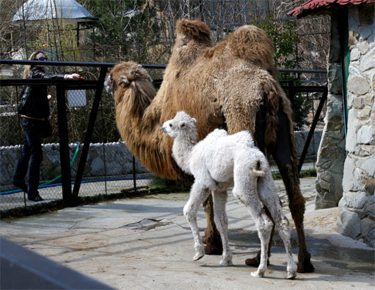 乌克兰雅尔塔的斯卡兹卡动物园,一头患有白化病的小骆驼在成年骆驼陪伴下与游人见面。