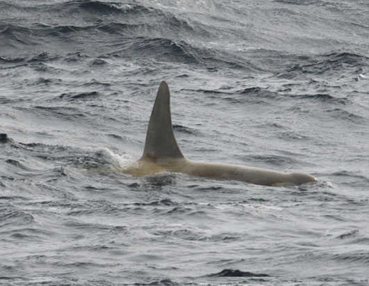 一头患有白化病的罕见逆戟鲸在阿留申群岛中部的卡纳伽火山附近水域现身。(秋凌)