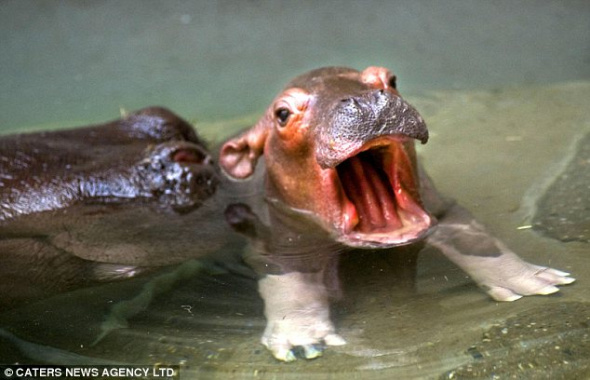 河马宝宝张开小嘴的可爱瞬间,将来它的嘴里会长满巨大的牙齿