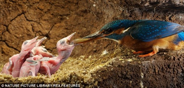 照片中,只有8天大的翠鸟幼仔挤在一起,享用父母带回巢穴的食物。借助于隐藏在鸟巢深处的照相机,英国摄影师得以捕捉到这一亲密感人的瞬间。这些摄人眼球的照片由英国摄影师和铁杆翠鸟迷查理·汉密尔顿·詹姆斯拍摄。摄影生涯中,他将全部精力都用在拍摄这种令人吃惊的鸟类上。长久以来,汉密尔顿·詹姆斯便一心希望能够捕捉到翠鸟筑巢和喂食的瞬间。