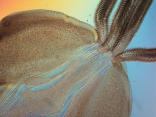 在澳大利亚美丽的大堡礁附近,生活着各种同样美丽的鮨科鱼。在这些鮨科鱼体内,还寄生着如图所示的鱼类绦虫。本图显示了一条鱼类绦虫的头部,头部伸出了四个触角。奇怪的是,这种鱼类绦虫总是在耐心等待它的宿主被鲨鱼吃掉,它们从而可以进入鲨鱼体内。一旦进入鲨鱼体内,它们就会利用触角上的钩子紧紧抓住鲨鱼的胃内壁,从而在鲨鱼胃内安家并产卵。不过,阿德拉德认为,这种寄生虫不会对鱼类或鲨鱼产生危害,因为它们产卵的数量并不多。