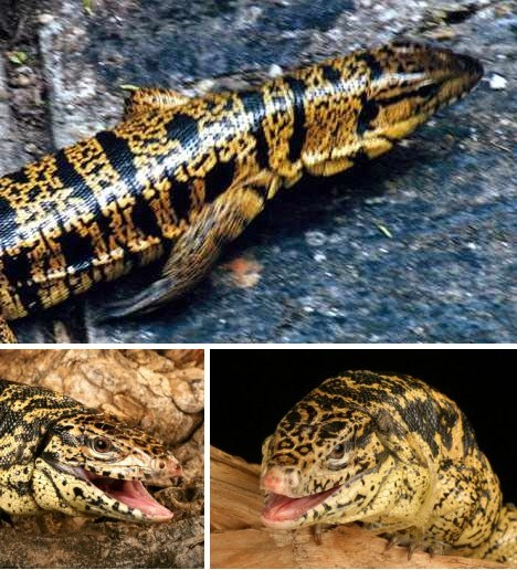 金色特古(Tegu)蜥蜴生活在南美洲,体型较大,它们的生态境与其他大陆上的巨蜥类似。它们的皮肤平滑有光泽,绚丽的金色与黑色条纹巧妙融合在一起,非常具有视觉冲击力。这种金色蜥蜴是受人欢迎的宠物,尽管性情易怒并且很难驯服。它们天生好斗,很难对付,从鼻尖到尾端的身长可达到44英寸(约合1.11米)。与其他Tegu种群有所不同的是,它们的食物主要以肉类为主。
