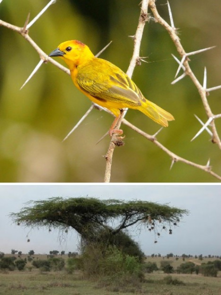 非洲金色织巢鸟学名“Ploceus subaureus”,生活在从肯尼亚到南非的非洲东部和南部地区。这种鸟会聚集成规模巨大的鸟群,数量可达到数千只。它们的鸟巢状如泪珠,在非洲大草原叶子脱落的树枝上,有时会悬挂着数十个这样的鸟巢。金色织巢鸟并不是濒危物种,它们的近亲红嘴奎利亚雀是地球上数量最为庞大的鸟类,数量接近150亿只。所有织巢鸟都以籽为食,它们有时会成群出没,疯狂掠食成熟的籽实作物,给非洲农民带来不小麻烦。(孝文)
