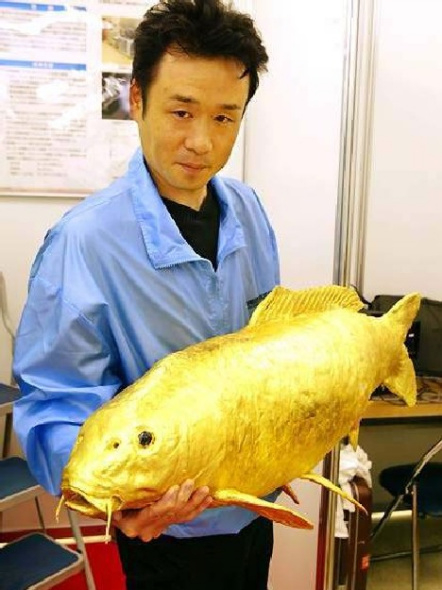 毫无疑问,这是一条最为另类的鱼,身上的黄金可能出自某个人之手,但这个人绝不是造物主。有一点可以肯定,它的饲养员参与了“制造”一条真正令人无法相信的黄金观赏性鲫鱼的过程。黄金鱼的一些部位可能并非天生就含有24克拉黄金,而是人为产物,但即使是“人造物”,诱人的黄金也会让它身价倍增,足以吸引所有潜在买家的目光。