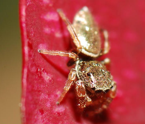 跳蛛是蜘蛛家族智商最高的成员之一。最后一幅图片中的跳蛛身长0.25英寸(约合6.35 毫米),堪称金装最吸引人的跳蛛之一。在玫瑰花瓣上,这只犹如宝石般的跳蛛建起属于自己的狩猎场,随时准备伏击猎物。一身闪闪发光的金色外衣与玫瑰亮丽的红色形成鲜明颜色对比,绝对可以吸引所有摄影师的目光。