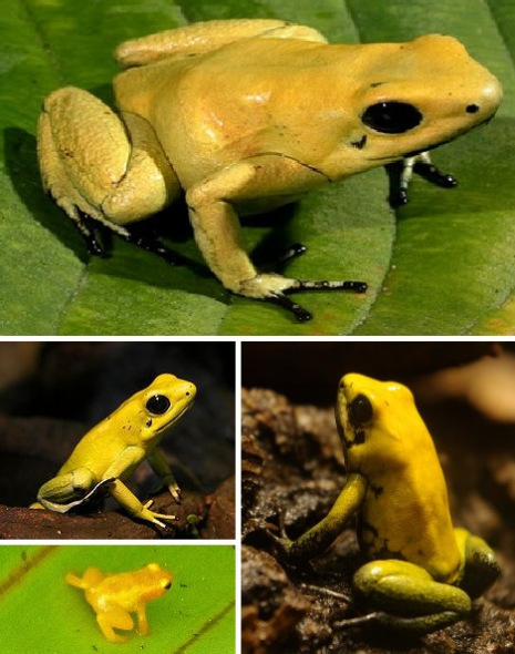 金色箭毒蛙家族有很多成员,其中包括Phyllobates terribilis,它们是世界上毒性最强的脊椎动物之一。这种青蛙从皮肤向外渗出的生物碱毒素所拥有的致命毒性达到令人不可思议的程度,仅1毫克金色箭毒蛙蟾毒素便足以毒死近1万只老鼠,或者10到20个人又或者2头非洲雄象,1克金色箭毒蛙蟾毒素可导致大约1.5万人送命。可以说,金色箭毒蛙是真正意义上“只能看,不能摸”的可怕动物。