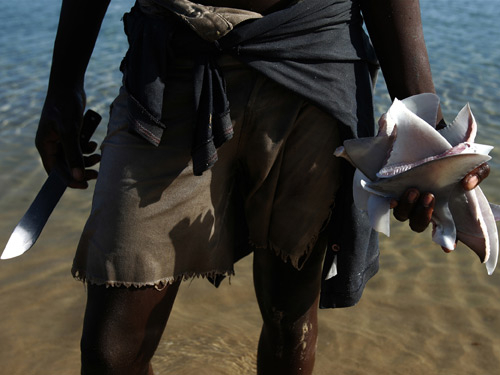 一位莫桑比克渔民手中抓着一把鱼翅。希尔顿表示,“最初,拍摄这些当地渔民是非常危险的,因为我们不知道他们会如何反应。而且在经过长期国内战争后,莫桑比克当地人手中并不缺少枪支。”