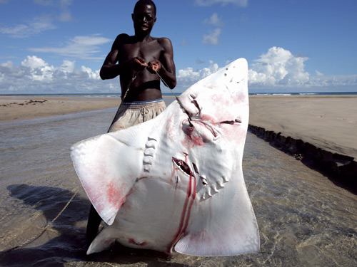 在莫桑比克,一位渔民正在展示一条刚刚捕获的鲨鱼魟。鲨鱼魟已被世界自然保护联盟列入濒危物种名单。摄影师希尔顿介绍说,“最令我震惊的是,它嘴中的刀子和钩子以及血淋淋的伤口。”