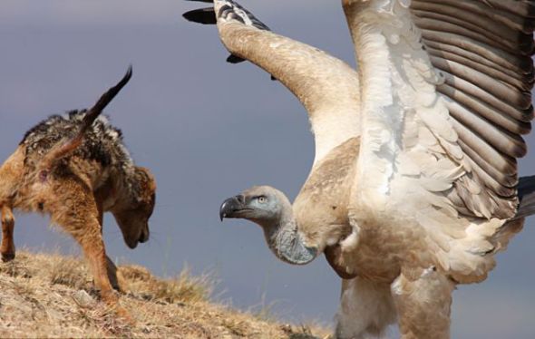 当这只豺看到站高3英尺(约合0.9米)的秃鹫独享美食,它实在是难以忍受,决心放手一搏。但豺显然没有料到食腐同伴的战斗精神。面对“胆大包天”的豺,秃鹫决心不与其分享美食,用利爪奋力攻击,而豺则迅速以锋利的牙齿回击。虽然在这场肉搏战中豺险些失去双眼,但它的毅力和决心还是获得了回报,最终美滋滋地叼着抢来的骨头溜走了。