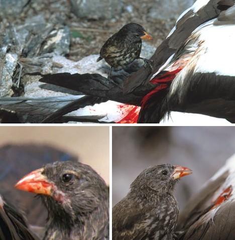 据认为,这种吸血雀最初进化出与加拉帕哥斯群岛上其他海鸟的共生关系。它们帮助其他海鸟寻找身上的寄生虫,找到后就作为自己的食物。这种拥有锋利喙部的鸟类在其他鸟类身上寻找寄生虫的过程中,难免会导致对方流血。它们发现,血液比虫子更美味。于是,它们最终进化出这种吸血的习惯。