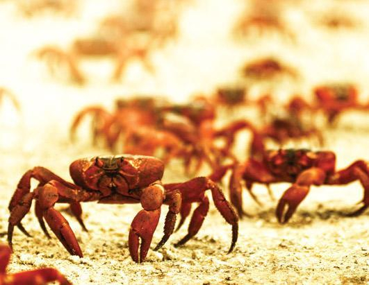 圣诞岛在浩瀚的印度洋中看起来只不过是一块小小的岩石,但它却是5000多万只红蟹的家园。圣诞岛红蟹每年一度的大迁徙都是一段最悲壮的历程,壮观的迁徙场面也最具视觉冲击力,给人以震撼之感。它们从岛上的森林深处一齐涌向海岸,只为了每年一度的繁殖后代,繁殖后它们又再次返回。在迁徙过程中,它们必须要克服重重困难和考验,其中最主要的敌人是一种身体可喷射腐蚀性酸液的黄蚂蚁。这些黄蚂蚁成为红蟹迁徙途中的主要杀手。
