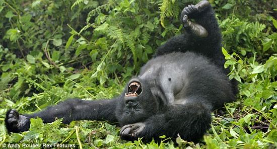 左边的照片在卢旺达北部的维龙加山拍摄,头发被打湿之后,小家伙得以拥有另类发型。维龙加山的森林面积达到79万公顷,生活着大约350只大猩猩,包括右图中这只表情搞笑的成年大猩猩。