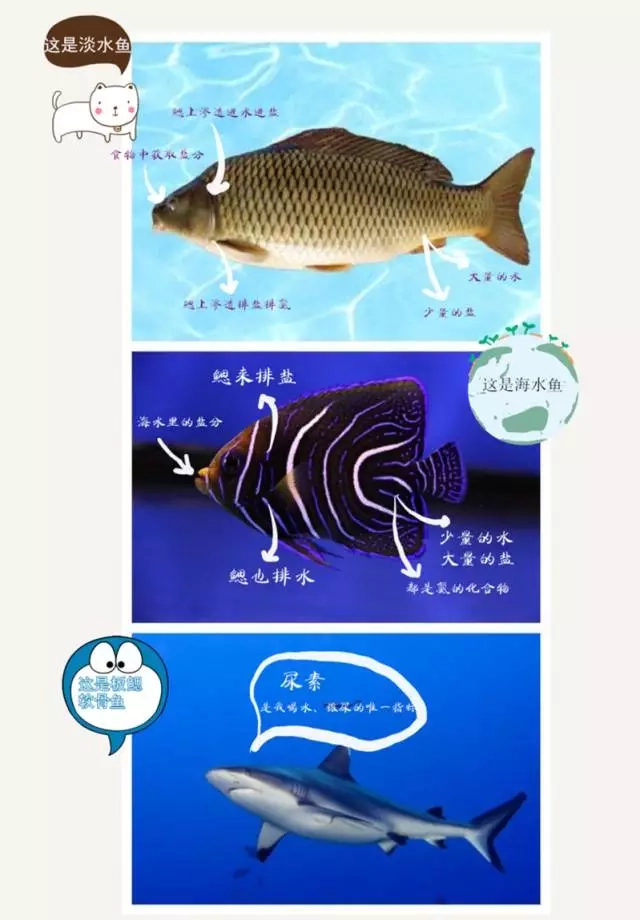 无论海水硬骨鱼还是海水软骨鱼,它们最终都是将氨以不同的化合物方式排出体外,为的是保持体内淡水含量,这样才能维持生命。
