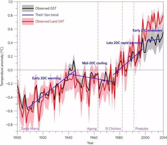 1900-2014年全球温度变化序列,数值为气候平均值(1961~1990年平均)的偏差,在长期增暖的趋势上,叠加有明显的阶段性特征:20世纪前期的快速增暖(1908-1945,多套资料集成趋势为0.149℃/10年)、20世纪中期的降温(1940-1976,-0.033/10年)、20世纪后期的快速增暖(1975-1998,0.163℃/10年)和20世纪初的增暖减缓(2001-2012,0.029℃/10年),总平均增温趋势为0.797℃/100年,竖直虚线表示几次大的火山爆发,图片来自于Yao et al. (2017)