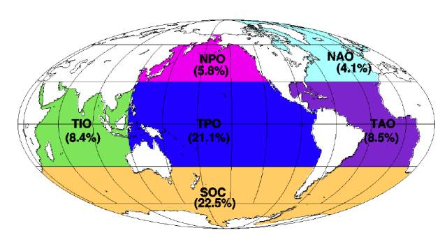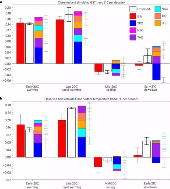 为了分析每一具体海盆海温在全球变暖中的作用,把大洋分为以下6个部分:TPO(热带太平洋)、NPO(北太平洋)、TAO(热带大西洋)、NAO(北大西洋)、TIO(热带印度洋)和SOC(南大洋),这一项研究还利用德国马普气象研究所的大气环流模式(ECHAM5.4.1) 做不同海盆的海温驱动的数值模拟,比如做TPO实验,即只在TPO海区用各个增速和减速时间段的实际海温变化趋势加气候态海温,而在其他地方用气候态海温,驱动大气环流模式,同时温室气体含量固定不变,这样得到的趋势变化,即反映了TPO海温变化在全球温度变化中的作用。