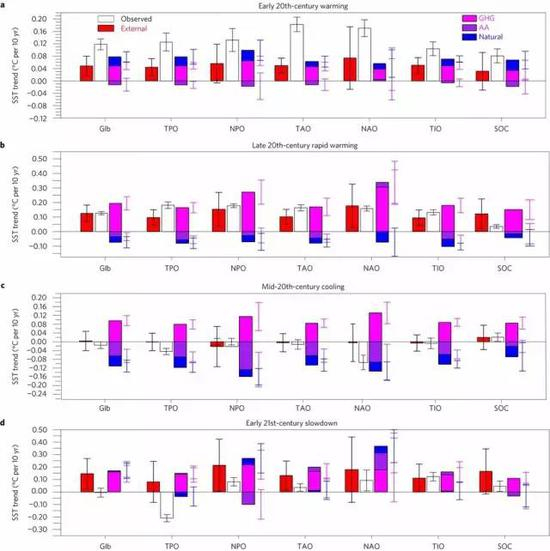 以下海区在四个时期(a,b,c,d)的观测、外源强迫数值模拟和区分三种强迫(GHG:温室气体,AA:人为气溶胶,Natural:自然变率)的海温变化趋势:Glb(全球海温)、TPO(热带太平洋)、NPO(北太平洋)、TAO(热带大西洋)、NAO(北大西洋)、TIO(热带印度洋)和SOC(南大洋)
