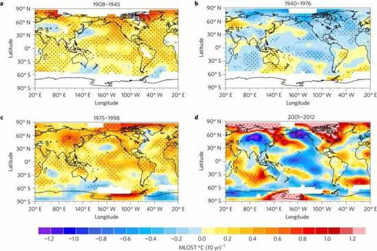 利用MLOST陆地气温和海洋表面温度(HadCRUT4)资料估算的20世纪前期的快速增暖期(1908-1945)、20世纪中期的降温期(1940-1976)、20世纪后期的快速增暖期(1975-1998)和20世纪初的增暖减缓期(2001-2012)的全球温度变化,其中点表示通过信度检验区。
