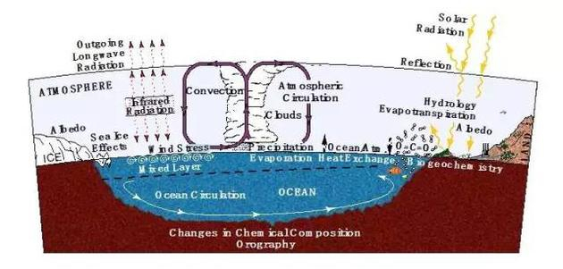 气候系统中的各分量和重要的过程,海洋是气候系统的关键组成部分,图片来自Neelin (2010) 《Climate Change and Climate Modeling》