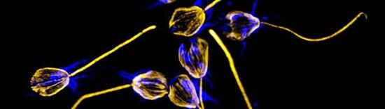费希尔氏弧菌促进了单细胞海洋生物-领鞭虫类的聚集和交配。微管蛋白被标记为金色,突出了细胞的形状和鞭毛;肌动蛋白被标记为蓝色,显示出独特的有机物