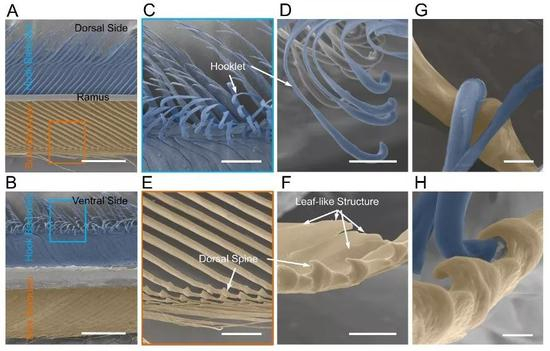 羽小枝的精细结构。(A, B)单个羽枝的背侧(A)和腹侧(B)结构。(C, D)每个带钩羽小枝具有四个从其中部伸出的下垂向后的钩子。(E, F)滑道羽小枝边缘卷曲,卷曲的的边缘在其端部转变为4-5个曲面三角形状的刺状结构,称为背刺。(G, H)钩子和背刺具有匹配的尺寸和形状。