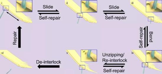 羽毛的级联滑锁系统的简化功能模型:当受到外力时,钩子的带状部分被拉直,钩子勾在滑道羽小枝的卷曲边缘上(图i)。随着外力的逐渐增大,钩子以卷曲边缘为滑道,往端部滑动,并且羽小枝也逐渐弯曲变形(图ii)。当力逐渐增大,羽小枝弯曲程度达到一定值时,钩子滑到滑道端部的背刺位置并与背刺形成互锁结构(图iii)。由于背刺改变了滑道的方向,阻碍了钩子因继续滑动而从滑道羽小枝上滑离。若想钩子从滑道上滑离,则需要增加外拉力,使得带钩羽小枝和滑道羽小枝继续弯曲变形,当弯曲程度超过某个阈值时,钩子和背刺的互锁结构被打开,钩子从滑道上滑离或勾在后面的背刺上重复这个过程,直至离开(图iv-vi)。如果在钩子离开滑道之前,外力消失,钩子则会由于羽枝的回弹力回到接近初始位置(图v-i)。