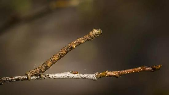 为了更像一根枝条,桦尺蠖除了会变颜色外,还会把腰板挺直,模拟一根分叉出来的树枝。